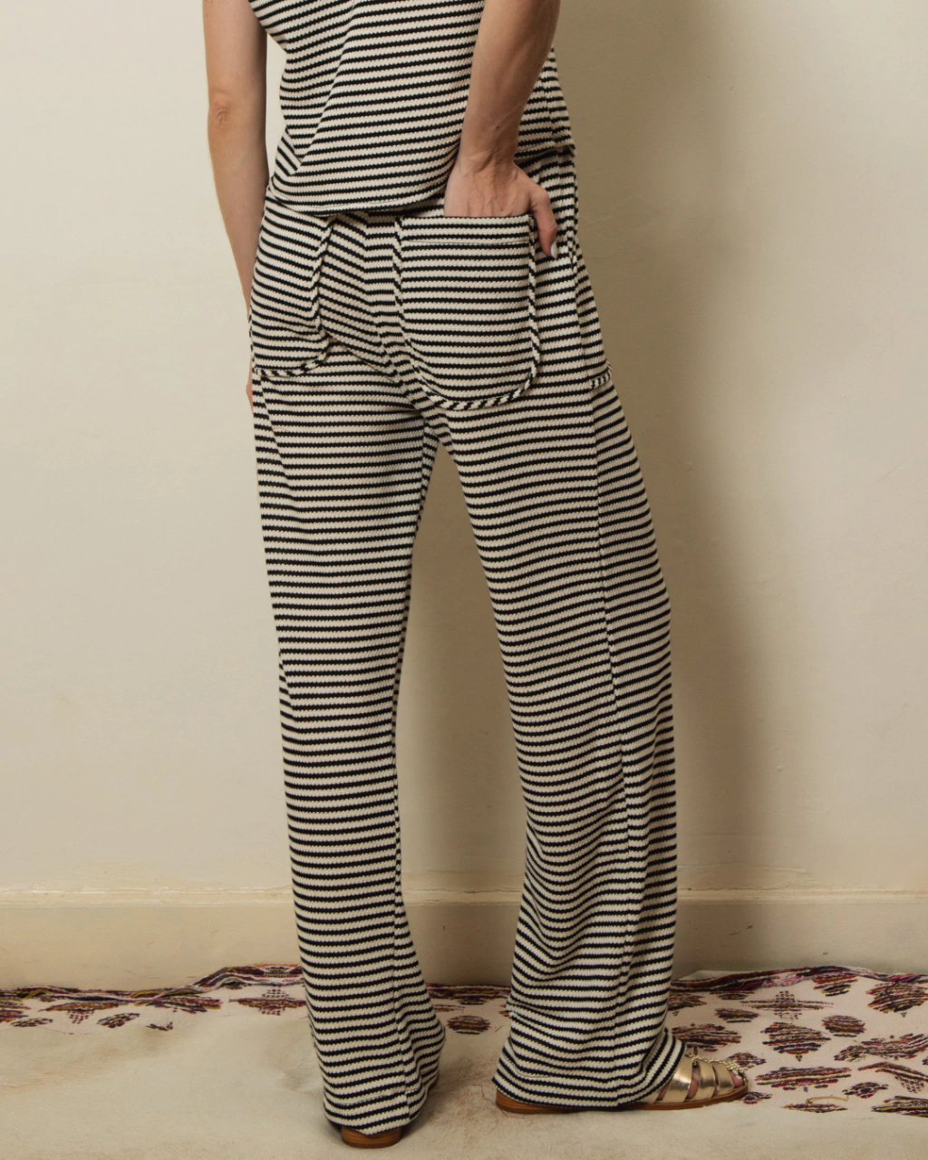 Calça pantalona listrada com bolsos grandes
