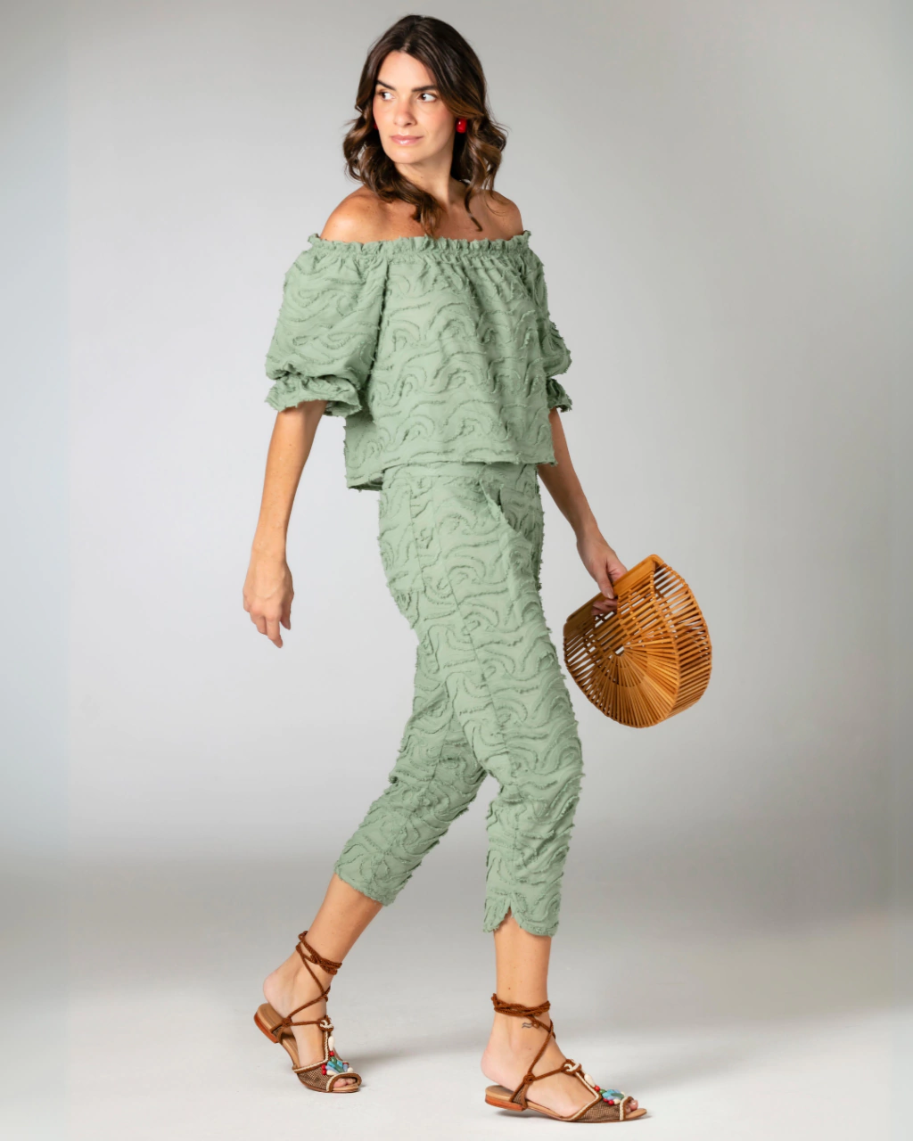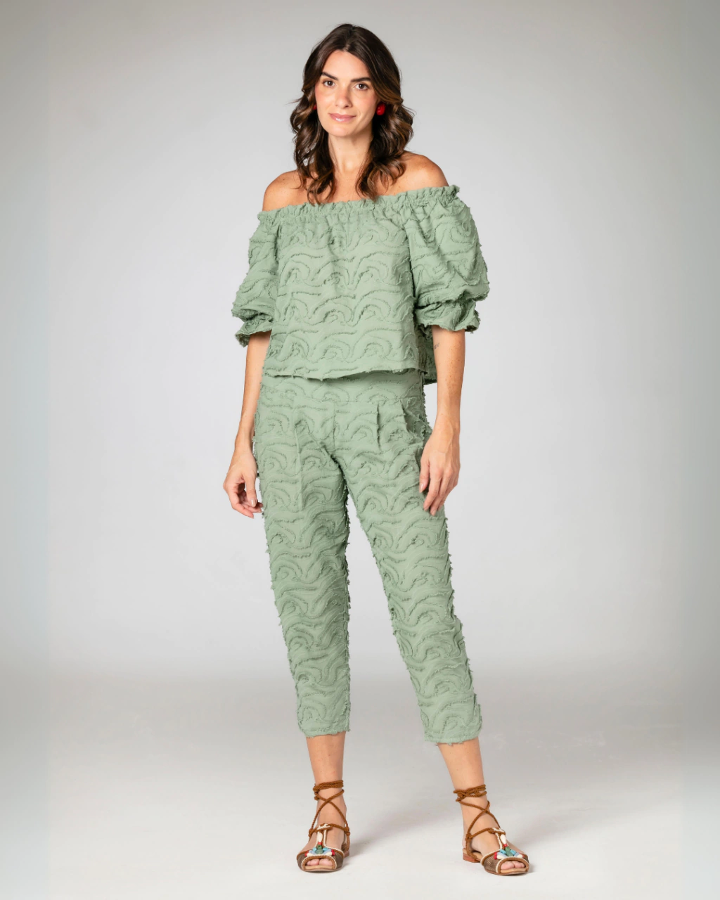 A Calça Lorena traz uma combinação única de elegância e personalidade, confeccionada em tecido 100% algodão com textura bordada e desfiada no estilo shivani. Em um tom sofisticado de verde belize, esta peça se destaca pelo seu design moderno e detalhes exclusivos.