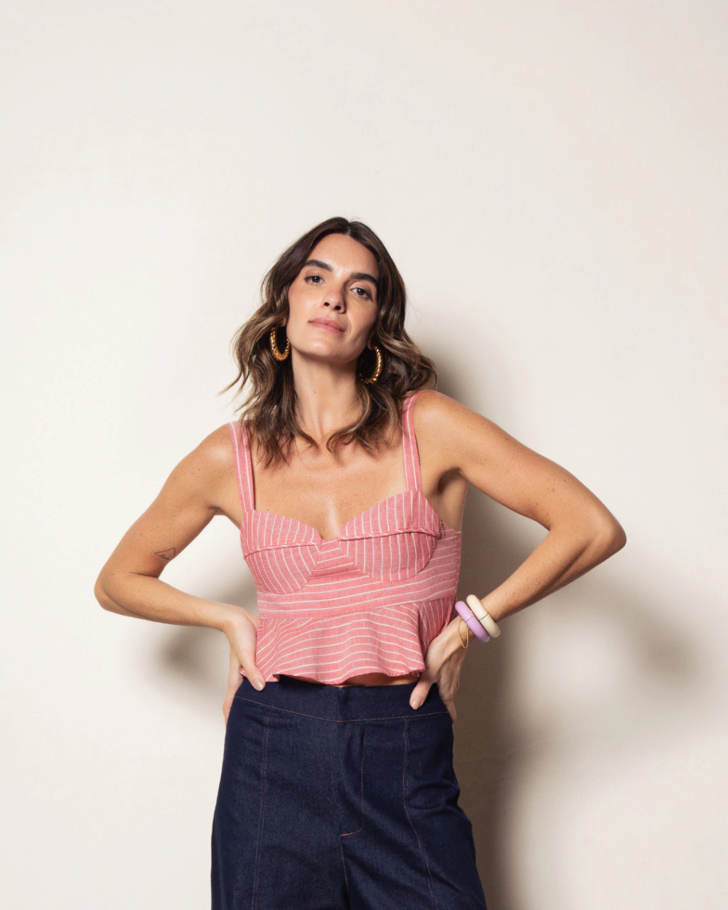 O Top Napoles é a escolha perfeita para quem busca um visual moderno e charmoso. Confeccionado em algodão reciclado, este top oferece um caimento confortável e sustentável, ideal para diversas ocasiões.