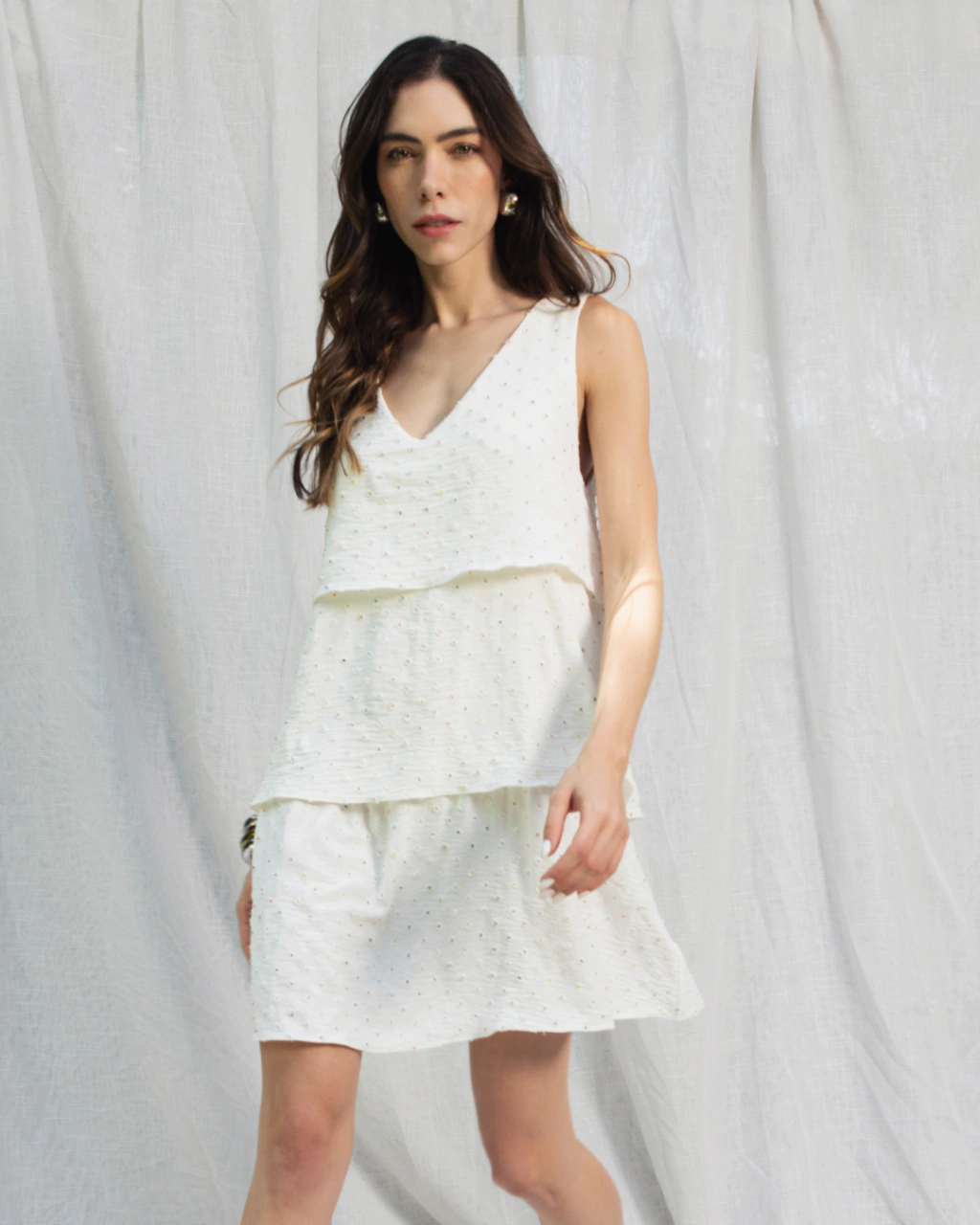 Vestido curto em camadas com decote em V. Aplicação de miçangas feito a mão.